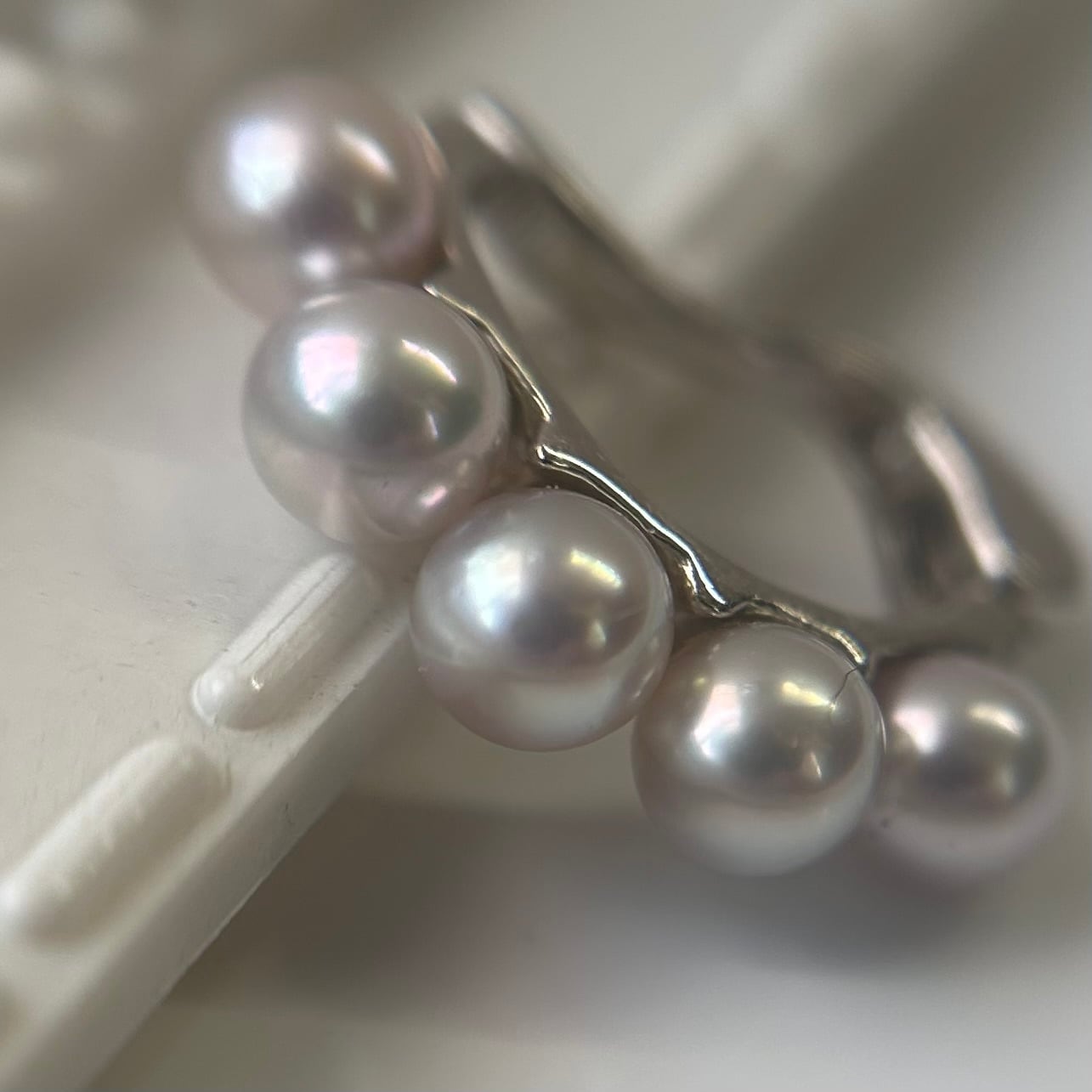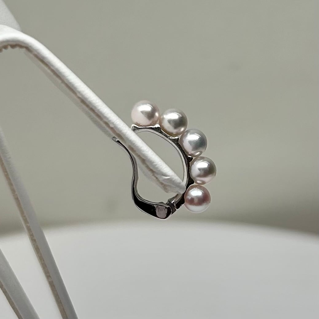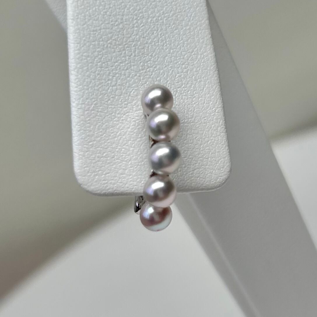ほんのりピンク色のナチュラルカラーの4㎜のあこや真珠が5個、優美に縦に並んでいます。耳元に軽やかに寄り添い、あなたのスタイルに華やかさをプラスします。